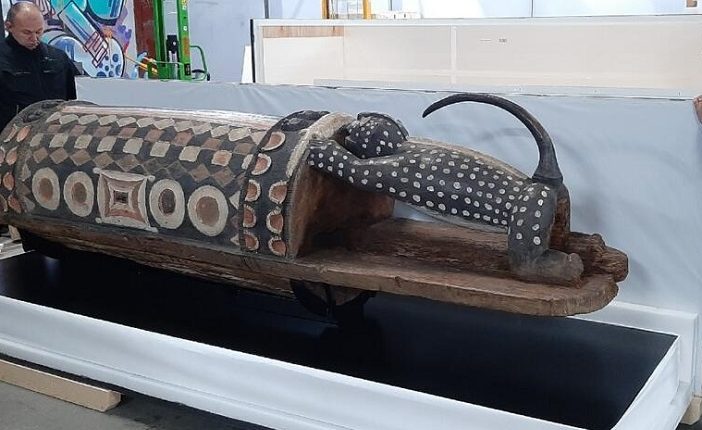 Le retour de cet imposant tambour de 3,31 mètres de long et de 430 kilos était bloqué par les reports successifs du vote d’une loi-cadre sur les restitutions de biens culturels.