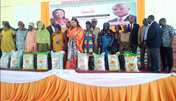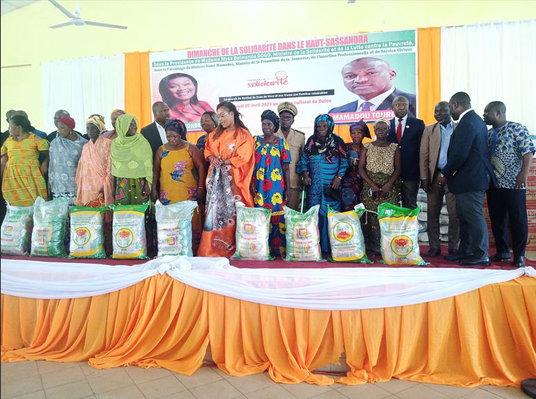 Après avoir effectué une visite aux ménages, en compagnie du ministre de la Promotion de la Jeunesse, de l’Insertion Professionnelle et du Service Civique, Mamadou Touré, cadre de la région, Mme Dogo a offert à ces personnes vulnérables, 1050 sacs de riz de 25 kg, 120 cartons d’huile de table, 100 cartons de pâte alimentaires, 198 cartons de sucre, 11 complets de pagnes, 11 matelas, un fauteuil roulant, un congélateur, 11 bassines, 11 seaux, 800 couches jetables, un poste téléviseur, 500 chaises et 5 000 000 francs CFA, au cours d’une cérémonie de remise de dons au centre culturelle de Daloa.