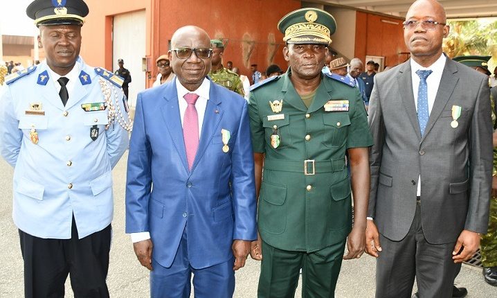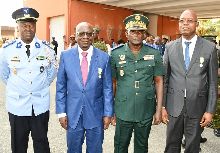 Le Directeur général des Impôts, Ouattara  Sié Abou recevant sa médaille des mains du Général Julien Kouamé  .