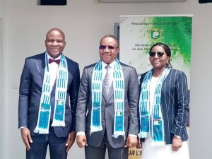 KONE Braman Oumar, Procureur de la République près le Pôle Pénal Economique et Financier(Gauche); Jean Sansan Kambilé, Ministre de la justice et des droits de l’Homme(Au milieu); Essoh Yanny Blanche épouse ABANET, présidente du Pôle pénal économique et financier