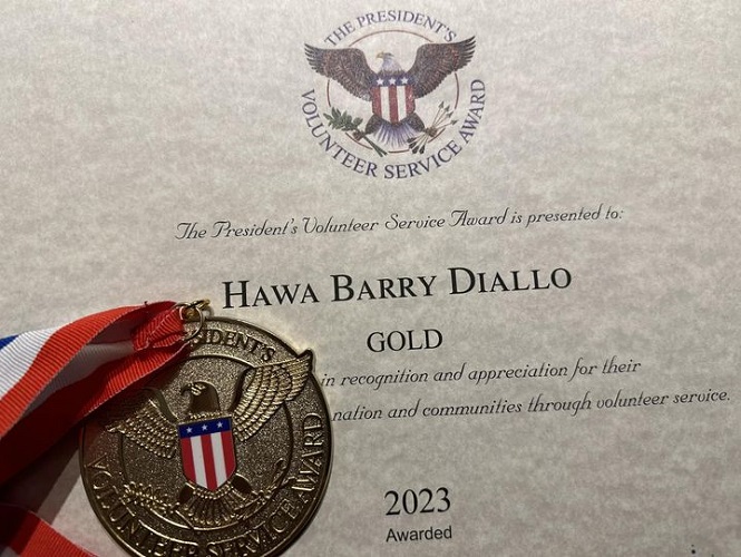 Citoyenne américaine d’origine guinéenne, Hawa Barry Diallo vient de recevoir récemment du Président de la République Américaine, Joe Biden, la Médaille d’or, pour sa modeste contribution au renforcement de la Nation Américaine, à travers le développement et la formation de jeunes filles dans les Communautés guinéennes.