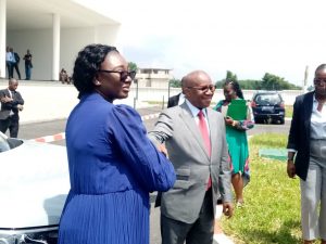 Madame Touré Prisca épouse Coulibaly, greffière en chef, recevant les les clés du véhicule de fonction par le ministre Sansan Kambilé